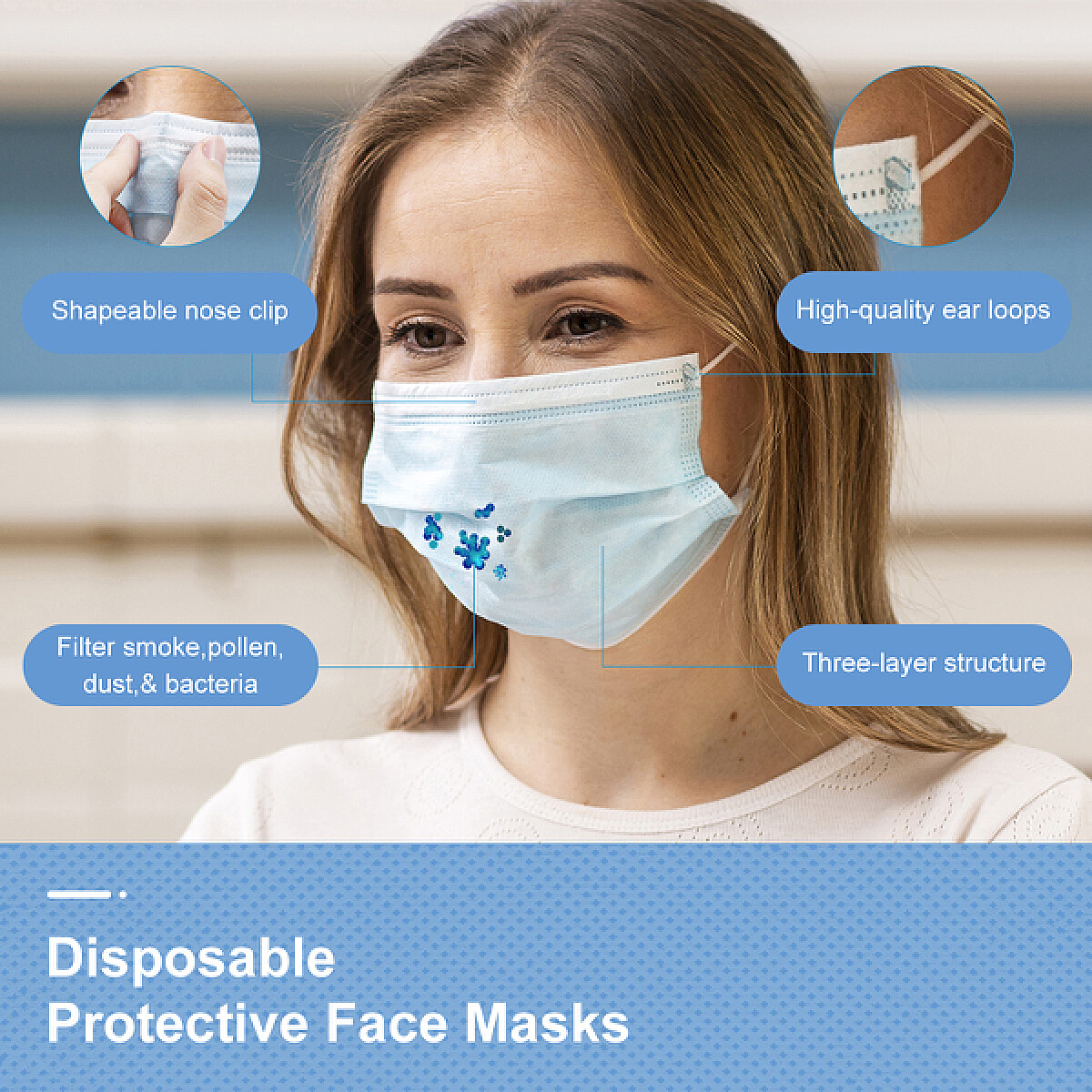 2、調(diào)整舒適度:調(diào)整耳帶,確保口罩佩戴舒適。